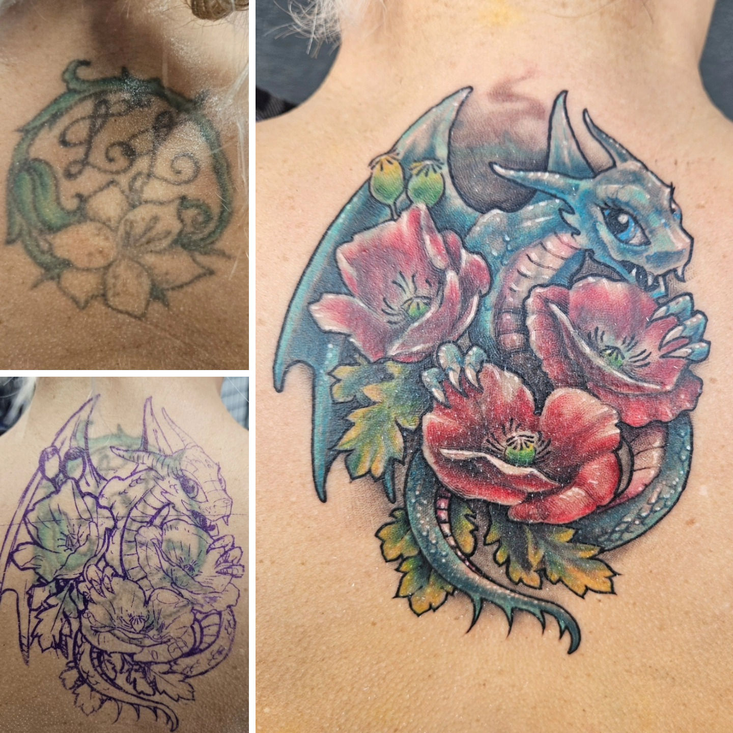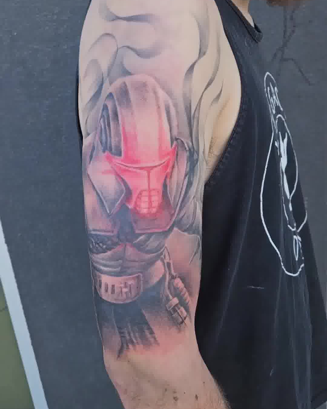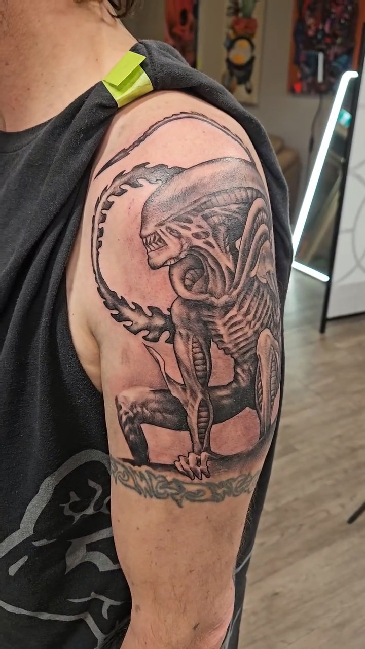 Cover up/redo on shoulder, stenciled Anubus and the hourglass and freehand all the biomech stuff.